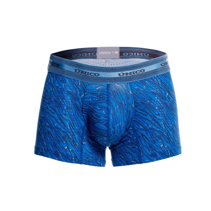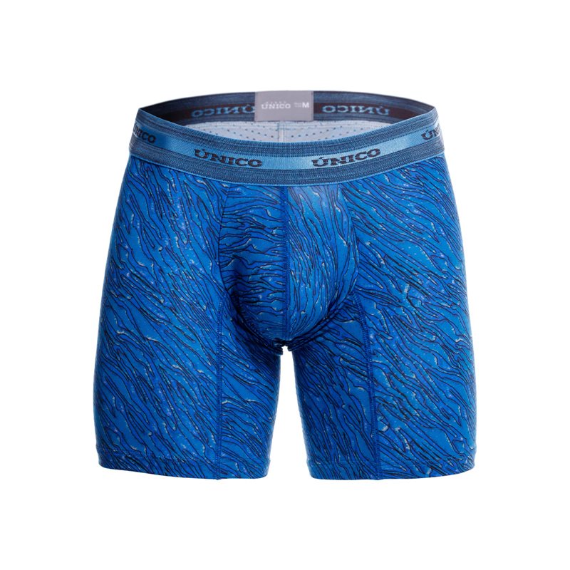 De Estraza Corto Boxershort van Unico is heel stijlvol en heeft een subtiele blauwe print en een jeansblauwe band. Unico boxers gaan tot 3 x langer mee dan ander merkondergoed. Normale boxers gaan vaak kapot op het zitvlak. Unico heeft een speciaal naadloos zadelkruis en gebruikt duurzame en slijtvaste stoffen. Unico is het enige merk op de markt die ontwikkeld is door medische specialisten. De Unico Cup creëert ruimte tussen je zaakje en je lichaam. Hierdoor blijft deze op temperatuur en houdt jij je zaakje gezond. Unico staat voor een premium merk het elastiek is van de allerhoogste kwaliteit en gaat nooit flubberen. Deze short heeft geen omhoog kruipende pijpjes en is zeer zacht en kleurvast.